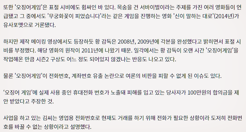 하지만 오징어게임 황동혁 감독의 말대로 2008년부터 이 작품을 구상해 왔다면, 그것은 2011년의 영화진흥위원회의 전화번호 서비스 개시보다도 이전일 정도로 오래동안 준비하였는데 이 정도 전화번호 유출 문제 하나도 예상 못했다면 너무 앞뒤가 안맞습니다.