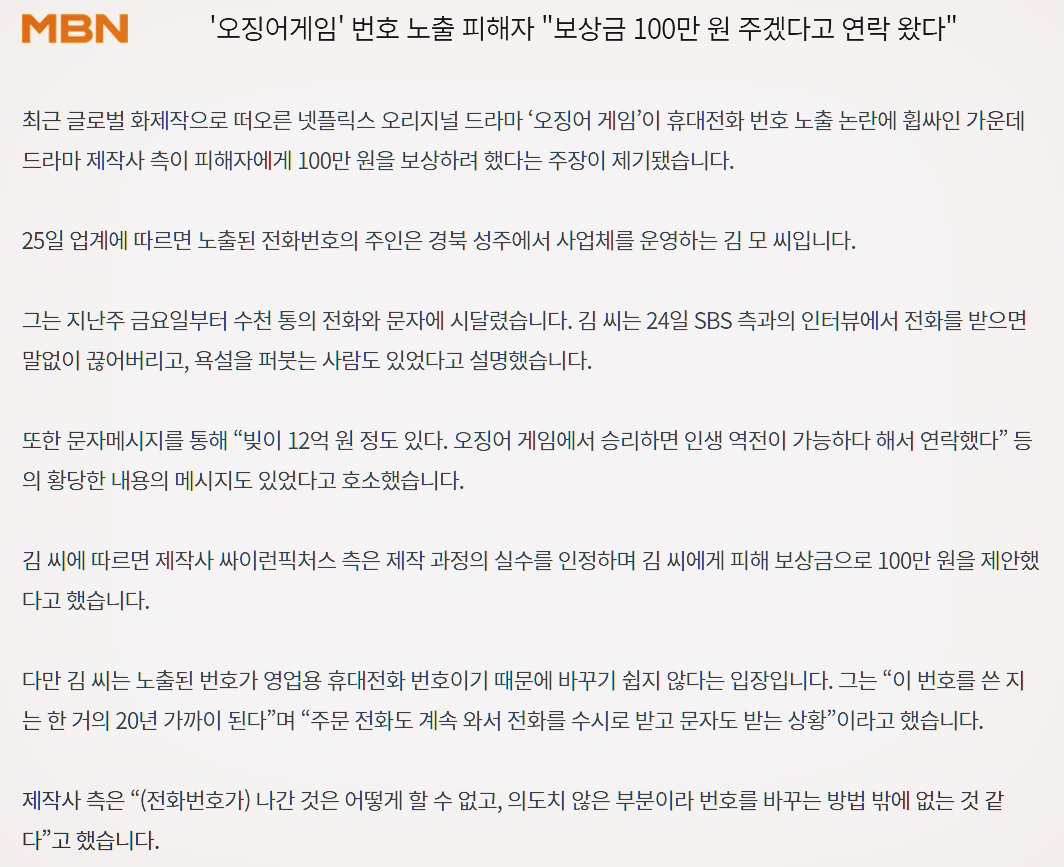 앞서 기사 스크랩을 통해 보셨겠지만 오징어게임 제작자측에서 피해자에게 제시한 전화번호 노출에 대한 피해 보상 금액이 100만원이었다는 것입니다.