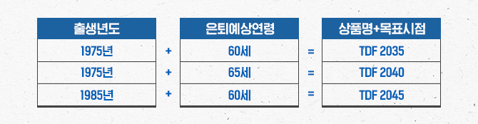 그런데, 위의 공식처럼 꼭 그 해당 숫자의 펀드를 선택할 필요는 없습니다. 일종의 가이드 라인이며, 숫자가 높을수록 주식 비중이 높아지고, 숫자가 낮을수록 채권 비중이 높아집니다. 본인의 투자성향에 맞게 안정적인 투자를 원하면 낮은 숫자를 선택, 적극적인 투자를 원하면 높은 숫자를 선택하면 됩니다. 단, TDF는 투자상품이기 때문에 본인의 책임하에 투자해야 하며, 손실의 위험도 있다는 점 유의해야 합니다.