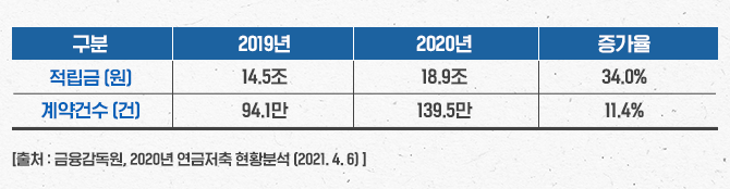 개인연금의 한 축인 연금저축은 납입하는 시기에는 연말정산 시 세액공제 혜택이 있고, 연금으로 수령하는 시기에는 저율의 연금소득세를 부과하는 금융상품인데요. 연금저축의 종류는 ‘보험, 펀드, 신탁’이며, 본인의 성향에 맞게 선택해서 가입할 수 있습니다. 4월 6일자 금융감독원 보도자료에 따르면, 2020년말 기준 연금저축보험의 적립금 규모는 약 110조원이며, 연금저축펀드는 약19조원입니다.(현재 연금저축신탁은 신규가입 불가) 연금저축보험 비중이 가장 높긴 하지만, 전년대비 증가율에서 연금저축펀드가 크게 앞서고 있습니다.(펀드 30.5%, 보험 3.8%) 작년 주가 상승으로 투자에 대한 관심이 높아지며, 연금저축펀드의 적립금 및 계약건수도 대폭 증가했습니다.