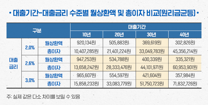 정부가 올해 청년층‧무주택자를 대상으로 하는 만기 40년의 초장기 주택담보대출을 선보일 예정입니다. 기존 대출상품보다 대출기간(만기)이 늘어난 만큼 매달 상환하는 원리금 부담을 줄일 수 있어, 청년층의 내 집 마련 기회가 늘어날 수 있다는 긍정적인 측면을 가집니다. 주택담보대출 상품의 선택지를 늘려 개개인의 대출성향에 맞는 상품을 제공한다는 점에서도 바람직한 방향으로 판단됩니다. 하지만 대출기간 동안 납입해야하는 총이자가 늘어나는 만큼, 당장의 대출 상환부담을 줄이고 더 많은 대출을 받기 위해 무분별하게 대출기간을 늘리는 선택은 바람직하지 않습니다. 의외로 많은 대출자들이 주택담보대출의 대출조건에 따라 매월 상환해야 하는 부담이 어떻게 달라지는지 면밀히 검토하지 않고 대출조건을 선택합니다. 이미 많은 인터넷 사이트나 모바일앱 등에서 해당 기능을 제공하고 있음에도 불구하고 간과하는 경우가 많습니다. 이번 포스트에서는 대출 상환방식, 대출기간, 금리 등 대출조건의 차이에 따라 월상환액 부담이 어떻게 달라지는지 예를 들어 살펴보고, 본인의 상황에 맞는 합리적인 대출상품을 선택하는데 도움을 주고자 합니다.
