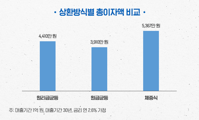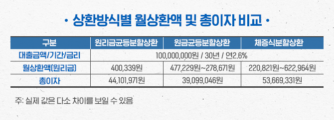 각 상환방식별로 상환부담은 어떻게 달라질까요? 아래의 표는 대출금액이 1억 원, 대출기간 30년, 대출금리는 2.6% 고정금리일 때 상환방식별로 월상환액(원리금)과 만기까지 낸 총이자액이 얼마나 되는지 비교한 내용입니다. 월상환액은 원리금균등이 약 40.0만 원으로 일정한 반면, 원금균등은 처음에는 47.7만 원으로 원리금균등보다 많으나, 만기 직전에는 27.9만 원까지 줄어듭니다.