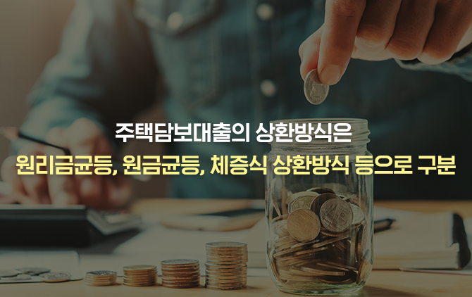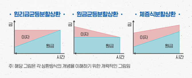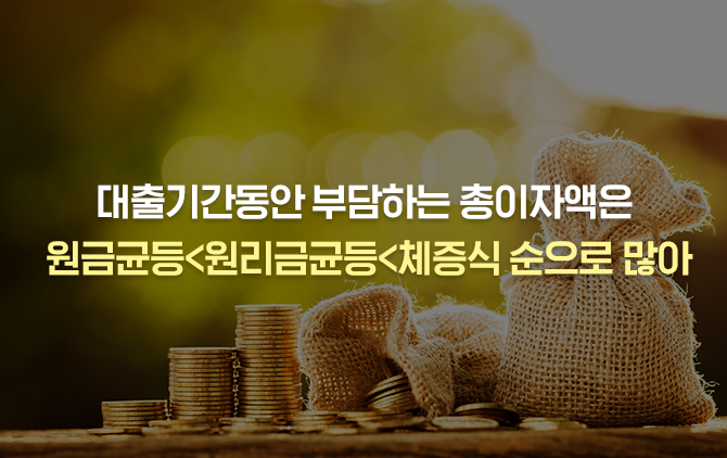 먼저 대출상환방법을 비교하도록 하겠습니다. 우리나라에서 주택담보대출의 상환방법으로 가장 많이 선택되는 방식은 원리금균등 분할상환방식입니다. 초기 원금 상환비중이 낮지만 만기까지 매월 원리금(원금+이자) 상환액을 동일한 금액으로 맞춰 상환계획을 세우기 쉽다는 장점이 있습니다.