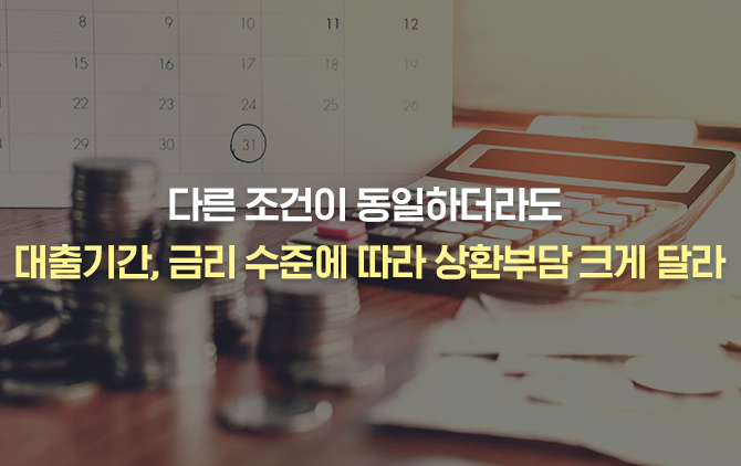 대출금리에 따른 부담은 대출기간을 30년으로 고정하고 살펴보도록 하겠습니다. 대출금리가 현재의 금리 수준인 2.6%일 때 월상환액과 총이자는 각각 40.0만 원, 4,410만 원이지만, 금리가 2.0%(-0.6%p)까지 떨어진다면, 월상환액은 36.9만 원(대출금리 2.6% 대비 -3.1만 원), 총이자는 3,305만 원(-1,105만 원)까지 떨어집니다. 반면 금리가 3.0%(+0.4%p)까지 상승한다면, 월상환액은 42.2만 원(대출금리 2.6% 대비 +2.1만 원), 총이자는 5,175만 원(+765만 원)까지 늘어납니다. 이와 같이 다른 대출조건이 모두 동일하다고 할지라도 대출금리에 따라 부담이 크게 달라지게 됩니다. 이 말은 현재는 경기상황 등으로 저금리 기조가 유지되고 있지만 앞으로 금리가 다시 오르게 된다면 대출자의 부담이 크게 증가할 수도 있음을 의미합니다. 아직 대출 전 기간 동안 금리가 변하지 않는 순수한 고정금리 대출이 적은 우리나라의 사정으로 볼 때 시중 금리의 변화를 보다 민감하게 받아들일 필요가 있겠습니다.