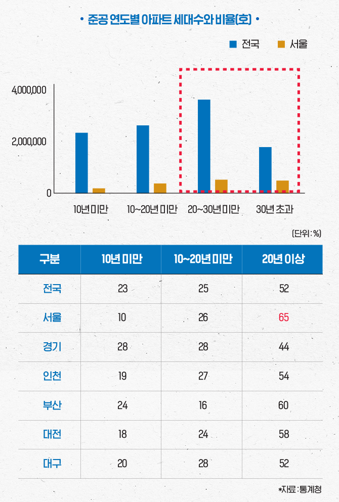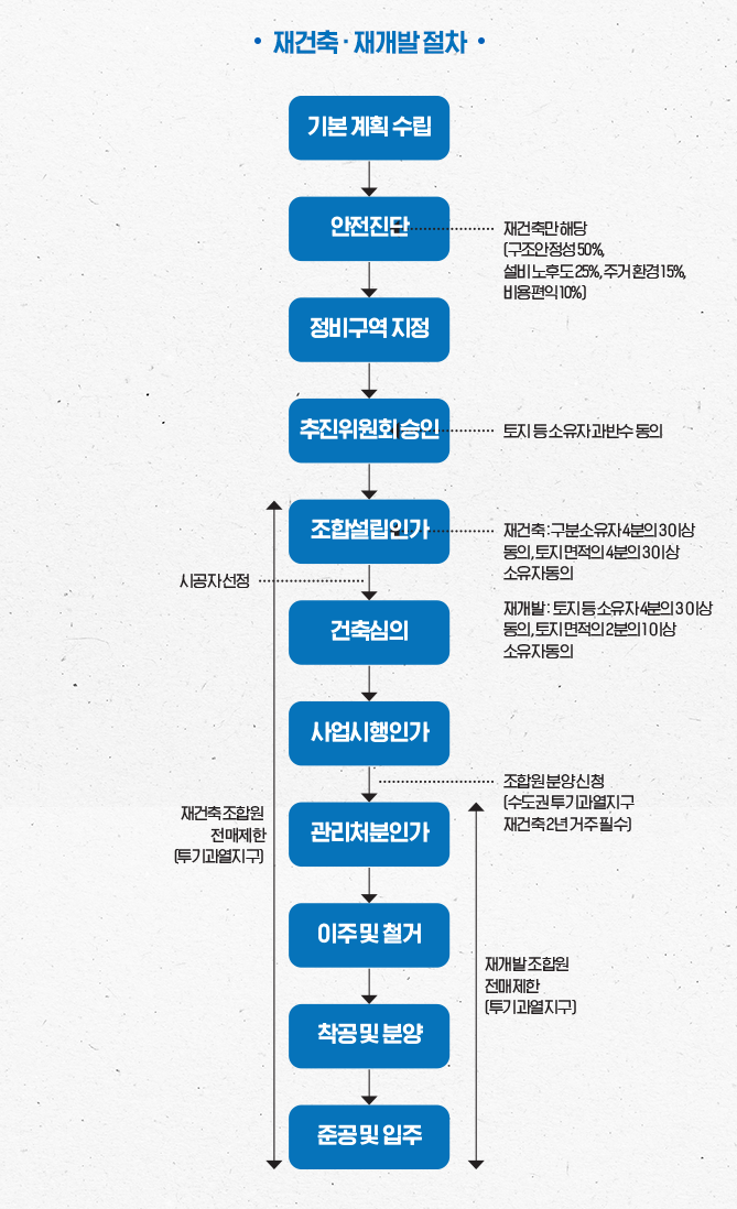 또한 20년 이상 된 서울 시내 아파트가 아파트 전체 시장의 65%를 차지할 정도로 노후화된 물량이 대기 중입니다. 이처럼 재건축·재개발 수요는 끝없이 이어지는데요. 본디 건물은 지은 순간부터 노후화가 진행되기 때문에 지금의 신축 건물이 미래의 재건축· 재개발구역으로 지정되는 것은 당연한 수순입니다. 언젠가 내 집도 이에 해당할 수 있기에 미리 공부한다는 마음으로 재건축· 재개발에 대해 알아보겠습니다.