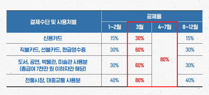또한 공제율은 신용카드 15%, 체크카드(직불카드등) 30%가 적용됩니다만, 아래의 표와 같이 3~7월까지 사용액에 대해서는 상향 적용됩니다.
