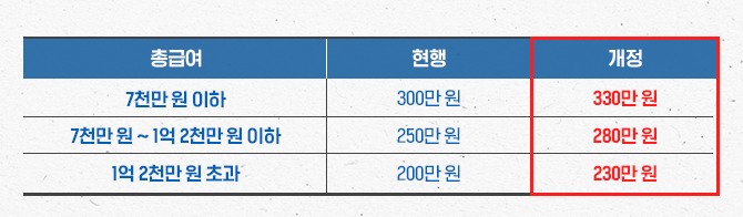 올해는 코로나 이슈로 움츠러든 소비를 활성화하기 위해 한시적으로 아래의 표와 같이 소득공제 한도액이 총급여 기준별로 30만 원씩 상향되었습니다.