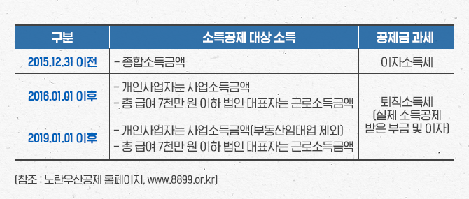 노란우산공제는 소득공제 대상 소득과 공제금 과세방식이 가입 시기별로 다르니 함께 확인해보셔야 합니다.