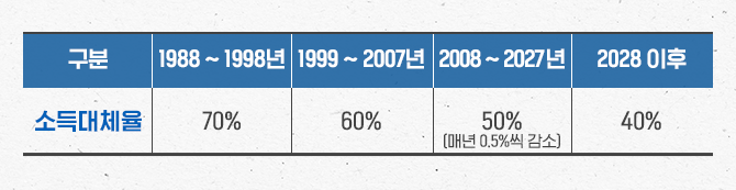A. 국민연금의 반납제도는 반환일시금을 다시 공단에 반납함으로써, 국민연금 가입 기간을 복원해 연금수령액을 늘릴 수 있는 제도인데요. 아래의 표에서 보듯이, 과거 소득대체율이 높았던 시기에 납입했던 국민연금을 반납하는 것은 높은 소득대체율을 부활시키는 효과가 있기에 가입자 입장에서는 유리합니다. 단, 반납금은 소정의 정기예금이자를 가산하여 납부해야 합니다. 금액이 클 경우, 신청 기간에 따라 3~24회 분할 납부 가능합니다.