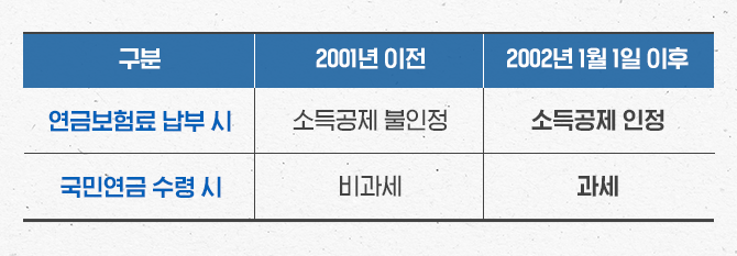 A. 국민연금에 부과되는 세금을 알기 위해서는 아래의 표를 먼저 확인해야 하는데요. 국민연금은 2002년 1월 1일 기준으로 그전과 후에 납입한 보험료의 과세 방식이 다릅니다. 2001년까지 불입분에 대해서는 소득공제가 없는 대신, 연금 수령 시에도 비과세입니다. 2002년부터 연금보험료에 대해 소득공제를 받을 수 있게 되었고, 이 시기에 납입한 연금보험료를 제원으로 지급된 국민연금에 대해서는 종합소득세를 과세합니다. 다른 소득이 없다면, 근로소득처럼 연금 지급 시에 원천징수되어 세금을 따로 납부할 필요는 없으나, 다른 소득이 있다면 다음 해 5월에 종합소득세 신고를 해야 합니다.