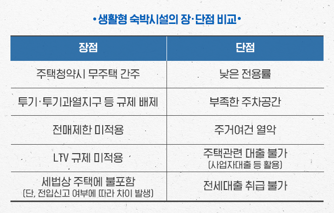 앞서 설명한 것과 같이 생활형 숙박시설은 주택법의 적용을 받지 않고 건축법의 적용을 받습니다. 쉽게 말해 생활형 숙박시설은 ‘주택’이 아니라는 것으로 해석할 수 있는데 이에 따른 장점과 단점이 있습니다.