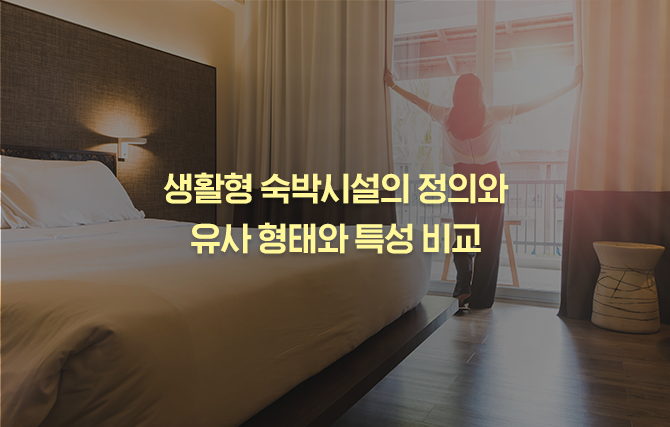 생활형 숙박시설은 「공중위생관리법」에서 규정되며, 해당법 상 실내에서 취사나 세탁이 가능한 숙박시설로 정의될 수 있습니다. 이는 2012년 1월 보건복지부의 공중위생관리법 시행령 개정을 통하여 규정된 것으로, 법률적 정의만으로는 실질적인 생활형 숙박시설을 설명하기 어렵습니다. 따라서 생활형 숙박시설과 유사한 다른 주거 형태와의 비교를 통하여 생활형 숙박시설을 살펴볼 수 있습니다.