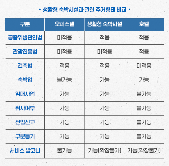 오피스텔과 생활형 숙박시설을 비교하면 두가지 유형은 모두 전입신고가 가능하고 취사가 가능한 시설이며, 「관광진흥법」에 적용을 받지 않는다는 공통점이 있습니다. 또한 오피스텔과 생활형 숙박시설은 임대사업이 가능하지만, 호텔은 임대사업이 불가능하다는 점에서 차이가 있습니다. 하지만 오피스텔은 숙박업 등록이 불가능하고, 서비스 발코니 설치가 불가능하다는 점에서는 생활형 숙박시설과 차이가 발생합니다.
