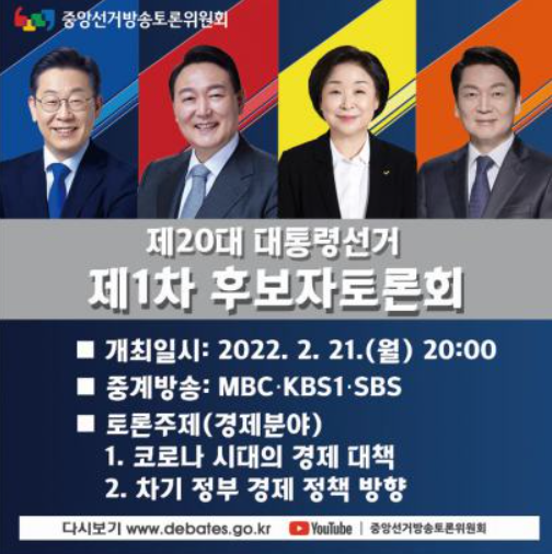 3월 2일 제 20대 대통령선거 3차 후보자토론회에는 공직선거법 규정에 따라 국회 의석수, 직전 선거 득표율, 여론조사 지지율에 의해 이재명(더불어민주당), 윤석열(국민의힘), 심상정(정의당), 안철수(국민의당) 후보가 참석한 토론회가 개최됩니다.