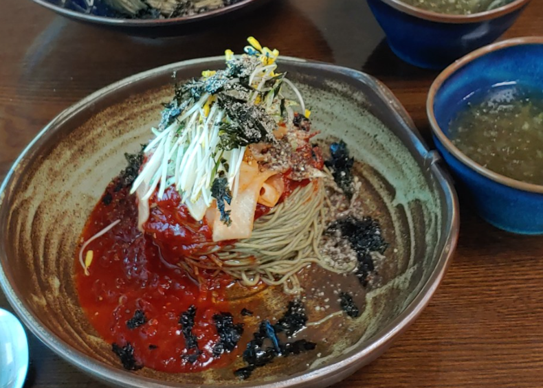 면수와 밑반찬 메밀 전병 등 생생정보 강원 평창 육회메밀비빔국수 가게 위치 봉평 메밀 미가연의 음식들은 모두 정갈하고 깔끔합니다.