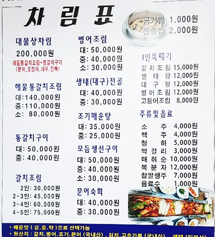 가격 : 해물통갈치조림 (대) 140,000원/ 해물통갈치조림 (중) 110,000원